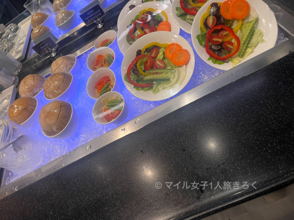 サラダとここにもあったココナッツジュース(シンガポール航空のシルバークリスラウンジにもあった。むしここの2箇所でしか見てない。)