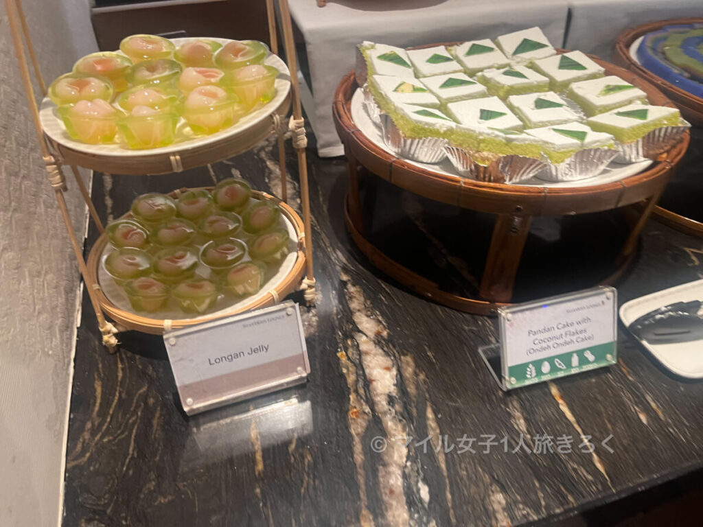 あとはデザート。各ラウンジ、パンダンリーフのケーキがある確率が高い気がする。がうれしい。