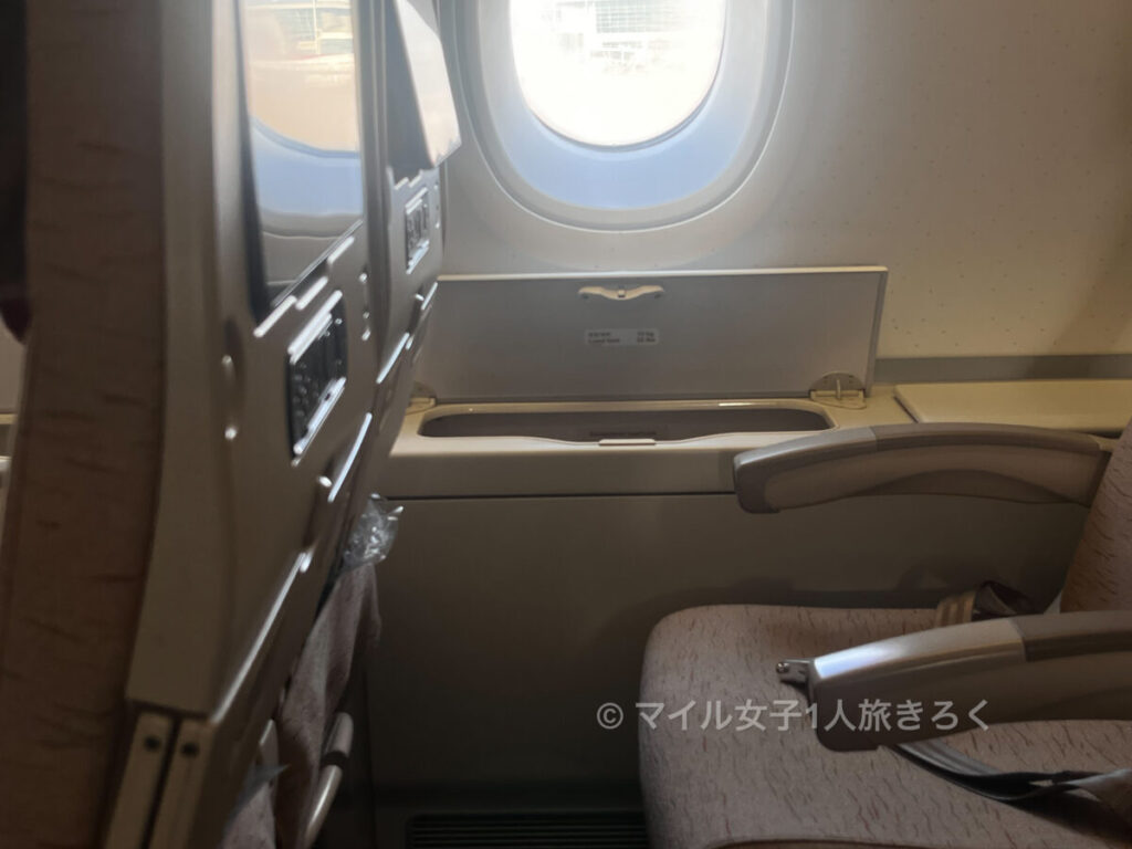 窓際の席はビジネスクラスにも設置されている物入がありました。