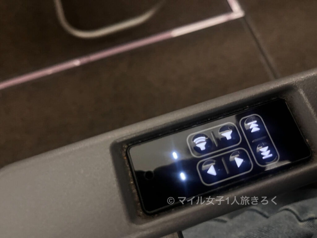 手元のリモコン。一応、スマホを使って機内エンタメは見れるのですが、使ったことがないんですよね。