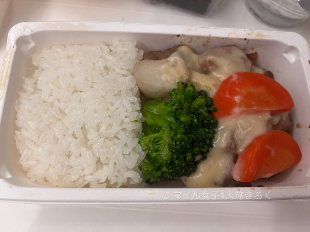 オレンジのゼリーとチョコケーキとメイン。このオレンジのゼリー美味しいんですけど、以前どこかの便で食べたココナッツとナタデココが入ったやつが私は好きです。
