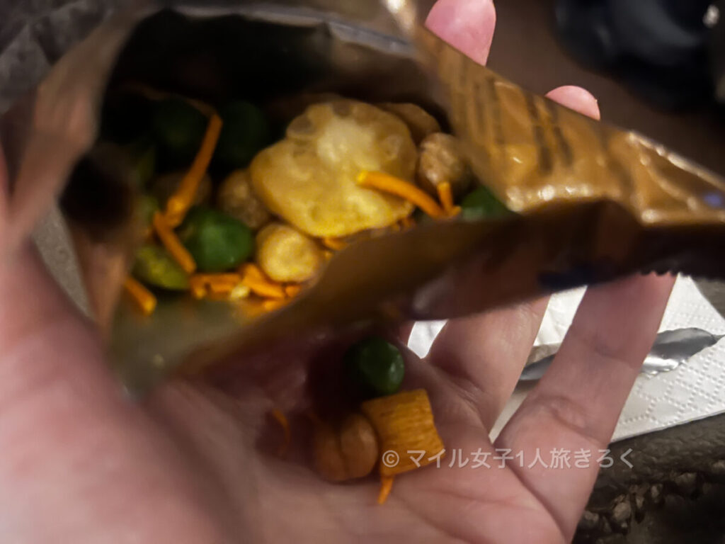 ナッツ類とベビースターラーメンが混ざったものみたいな感じで、これめちゃ美味しかった。お酒とあう。