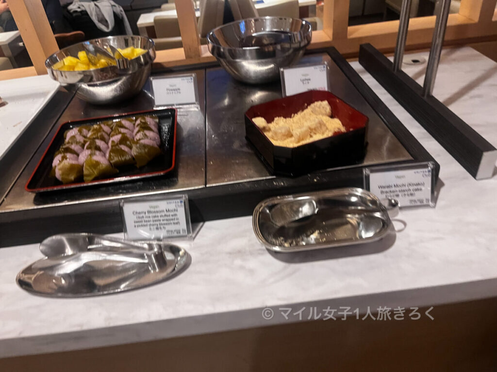 パンもミニチーズベーグルや、デザートはわらび餅とプチケーキ。フルーツもあります。このときライチが回収されてました。