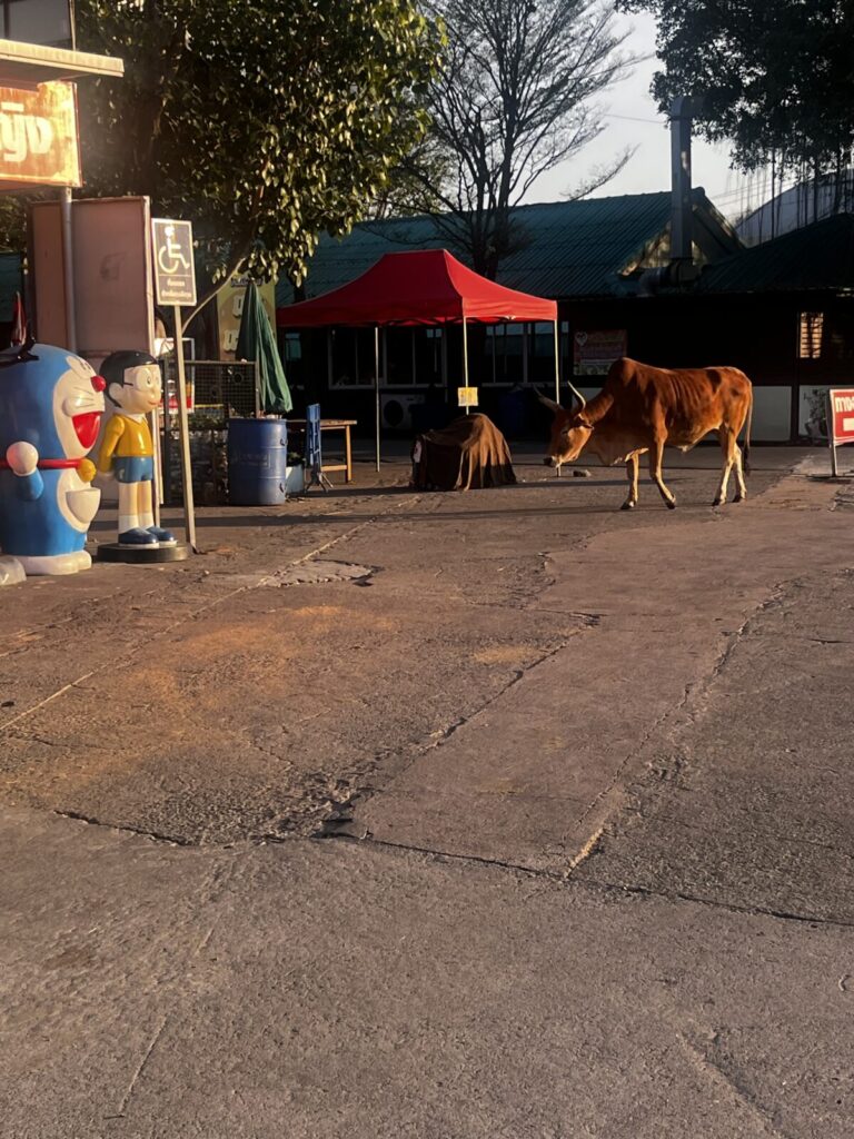 牛もいたり、小さい象もいたり…。ちなみに駐車場が広めなところだったのですが、セブンイレブンもあります。