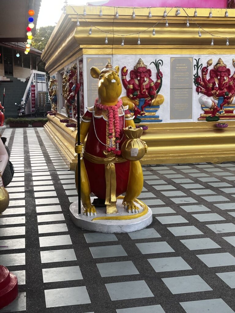 ガネーシャの周りには色の違うネズミ像が並んでおり、そのネズミにお願いをするのですが、自分の誕生日の曜日によってお願いするネズミの色が異なります。ネズミはガネーシャの使いとされ、願い事を神様に届けてくれる存在といわれています。