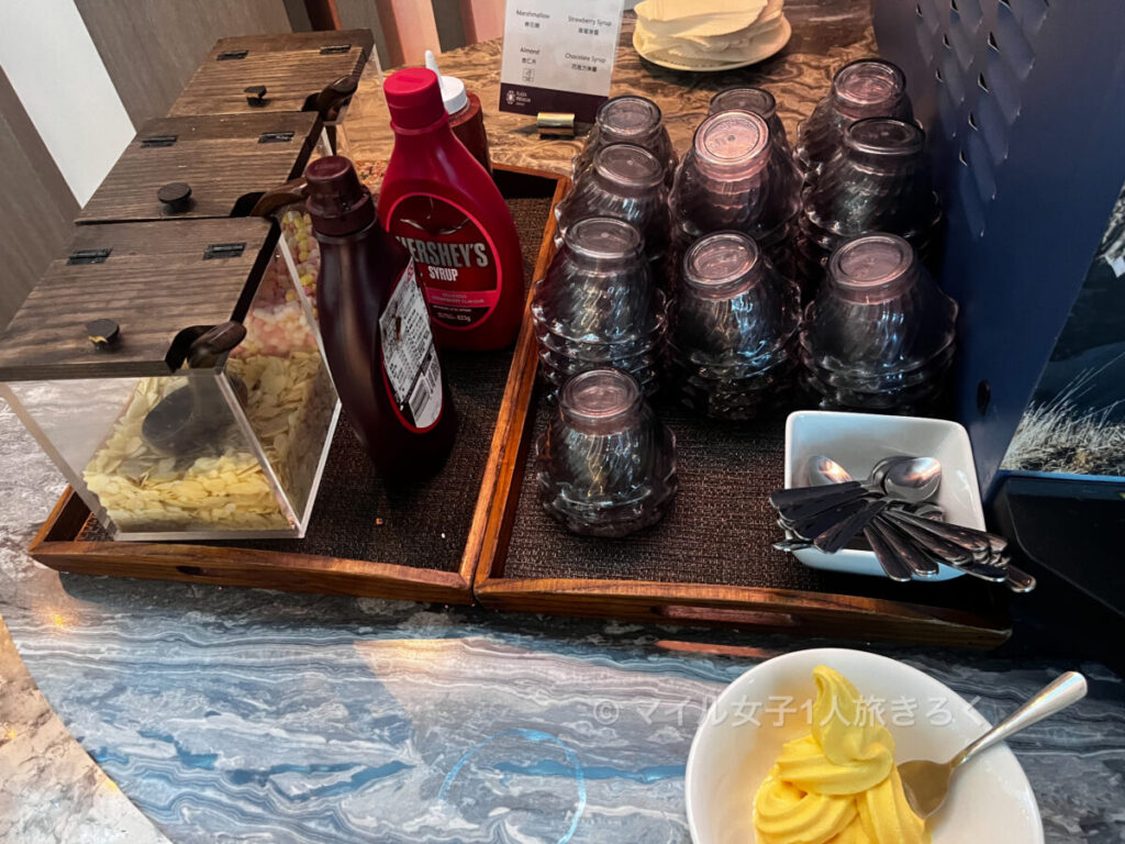 そして、私が最初に行った時、アイス用の入れ物がなかったので、フードの方に行って別のお皿を持ってきてそれに盛ってしまったのですが、こんな感じで作りました。