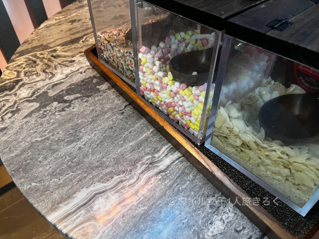 カラースプレーとかマシュマロ、スライスアーモンドやシロップ等