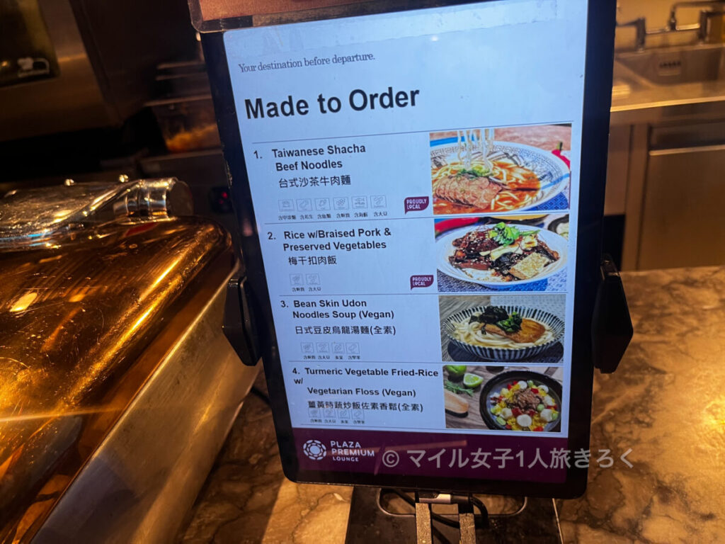 桃園のプラザプレミアムラウンジはラウンジごとに若干メニューが違うのですが、フードを作ってくれるところがあるので、出来立てを食べる事ができます。