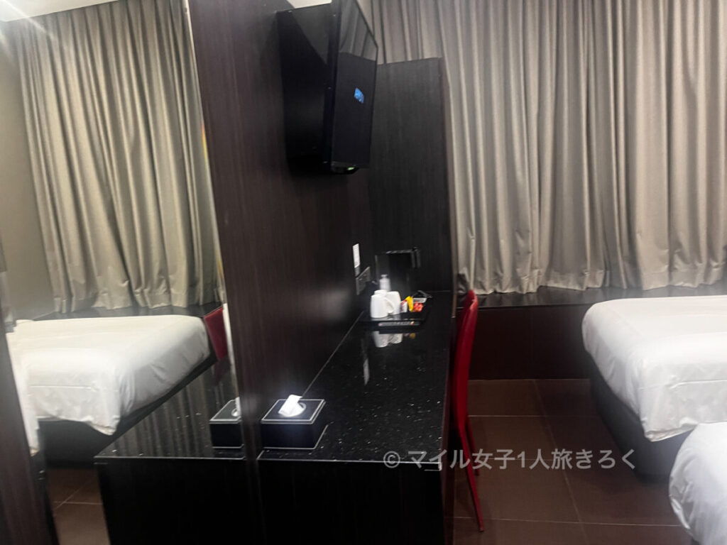 ただ、ダブルベッド前が全身鏡でした。風水とか気にする人は微妙かも。
