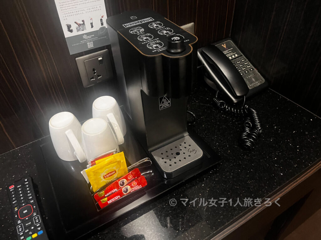 机の上にはコーヒーマシンもあるのですが、水は洗面所から出して使ってねという説明もあります。