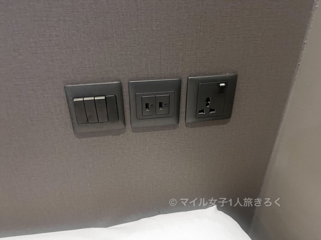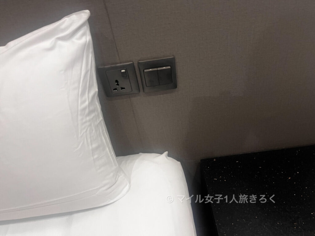 奥の枕で隠れてますがダブルベッド側に電源があります。